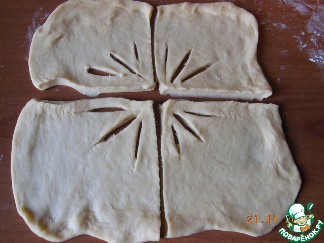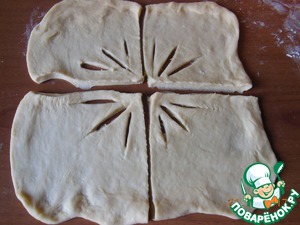 • Раскатываем в прямоугольный пласт. Делим его на 4 части. В углу каждого квадрата делаем 3 надреза.