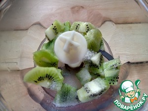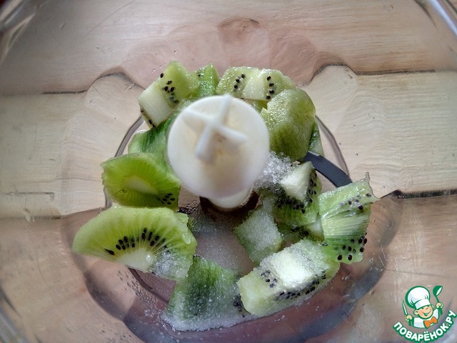 Для соуса нужно измельчить при помощи блендера четыре киви с водой, пятый киви нарезать на ломтики. -