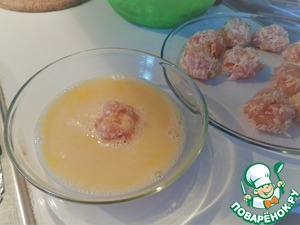 Каждый шарик окунаем в яичную смесь и обратно складываем на эту же тарелку.