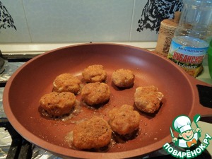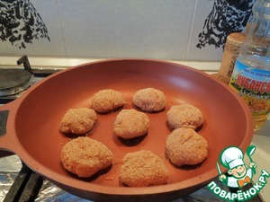 Каждый шарик который мы предварительно окунали в яичную смесь начинаем валять в сухарях и формируем их в небольшие шайбочки. Выкладываем их в разогретую предварительно сковородку и добавляем растительное масло.