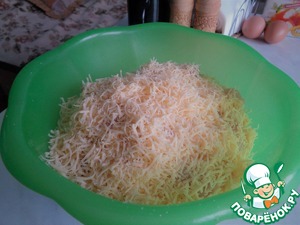 Натрите сыр на мелкой терке, и добавьте к куриному филе.