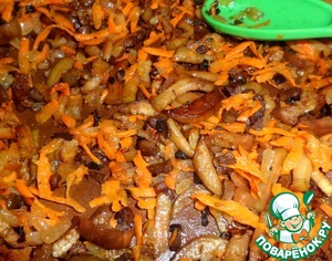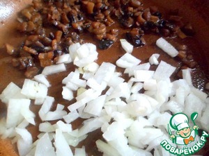 Обжарить мелко нарезанные грибы, добавить к ним мелко нарезанный лук, еще обжарить вместе, до прозрачности лука, помешивая, на среднем огне.