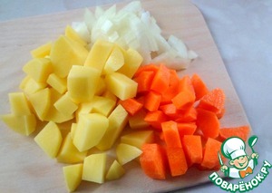 Почистить и нарезать произвольно овощи, все -равно будем пюрировать. Луковицу нарезать одну.