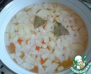 Все закинуть в кипящую воду, добавить лавровый лист, немного соли, как закипит, убавить огонь и варить до готовности овощей.