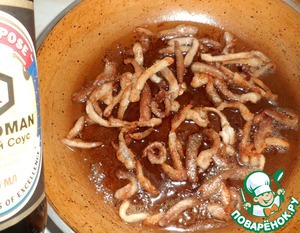 Тем временем нарезать соломкой бекон и обжарить до хруста, влить ст. ложку соевого соуса ТМ Киккоман. Перемешиваем, даем с полминуты покипеть в соусе, снять на блюдце.