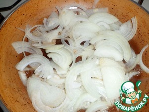Вторую луковицу нарезать полукольцами и обжарить на растительном масле до золотистого цвета, добавить сахар и все время перемешивать, чтоб получился однородный золотистый цвет. Снять лук на блюдце.