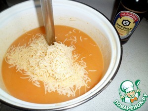 Как только овощи будут готовы, слить жидкость через дуршлаг в другую кастрюльку, во избежание горячих брызг. А овощи пробить блендером до пюре. В процессе добавить натертый сыр и еще пробить блендером