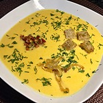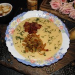 Разлить по тарелкам. Посыпать суп мелко нарезанным укропом. Сверху раскладываем жареный бекон и лук, а так же гренки.