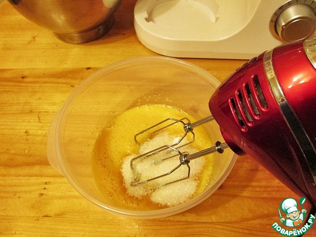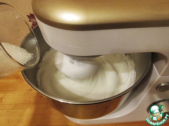 Теперь белки. Сахар вводим за два раза. Первый раз, когда они полностью побелеют…