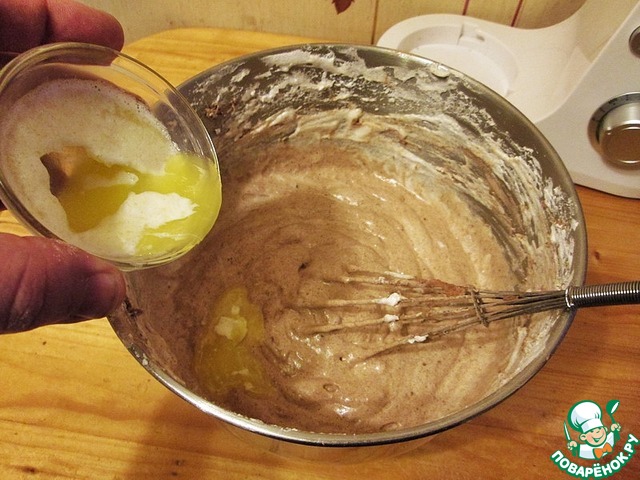 В самом конце вводим масло сливочное, растопленное и охлажденное до комнатной температуры… Быстро размешиваем. Масло сильно «воздушность» убивает…