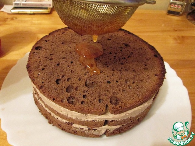 Протираем джем на верхний корж. Протирка нужна, чтобы было без комочков