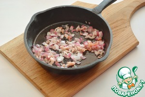Разогрейте масло на сковороде и слегка обжарьте бекон с луком до прозрачности