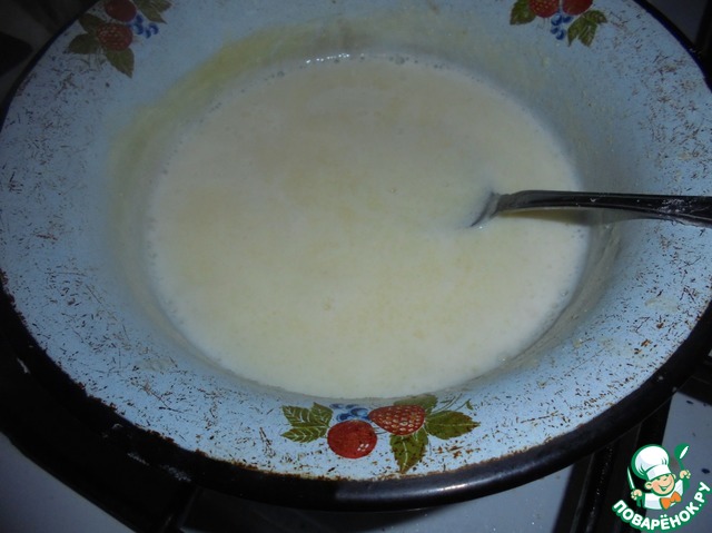 Для начинки молоко довести до кипения, добавить сливочное масло, сахар, манную крупу семолина и варить на медленном огне 3-4 минуты.