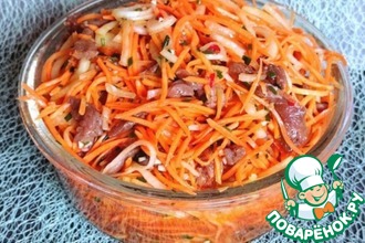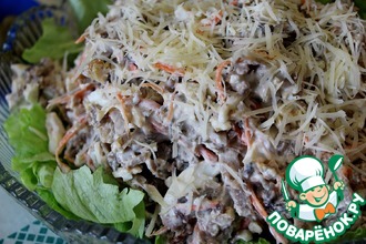 К мясу добавить репчатый лук, нарезанный тонкими полукольцами или кубиками. Если лук "злой", лучше ошпарить его кипятком, а потом обдать ледяной водой, или замариновать в смеси вода / уксус 1:1 с щепоткой сахара, что придаст большую пикантность салату.
