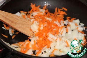 • Раскалить в сковороде растительное масло, жарить 5 минут рубленый репчатый лук, измельченный чеснок и тертую на терке морковь.