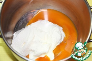 • Желтки яиц отделить от белков. К желткам добавить сметану, взбить.