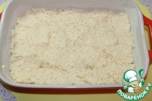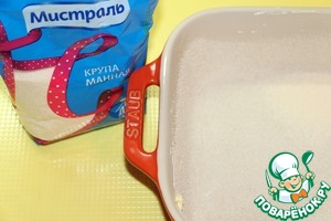 • Форму для запекания смазать сливочным маслом, припылить донышко и бортики формы манной крупой.