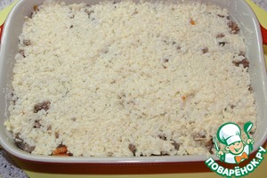 • Выложить 2/3 рисовой смеси. Нижний слой рисовой смеси должен быть толще, чем верхний. Тогда при нарезании, запеканка не развалится.