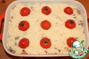 • Утопить помидоры черри. Если помидорки маленькие, они хороши целиком, у меня крупные, резала пополам. Запекать 20 минут в разогретой до 200 градусов духовке. За 5 минут до окончания запекания посыпать тертым сыром, сыр должен только расплавиться вокруг помидоров, хрустящая сырная корочка не должна образоваться, дабы не пропала нежность запеканки.