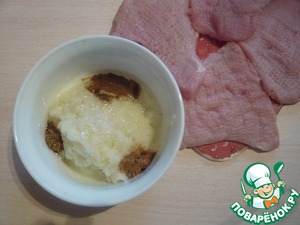 Этой смесью смазываем кусочки мяса с 2 сторон.