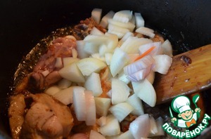 Добавить лук. Жарить 5 минут, перемешивая. -