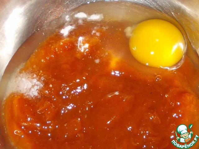 В миску выкладываем абрикосовое варенье, вбиваем яйцо, всыпаем соль и ванилин. Перемешиваем.