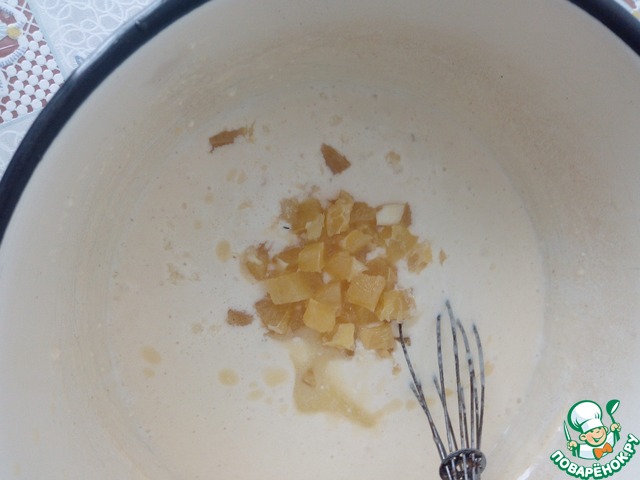 Масло растопить, мякоть апельсина нарезать. Добавить в тесто.