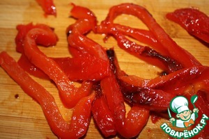 С запеченных перцев снять кожицу, удалить семена и нарезать их на полосочки.