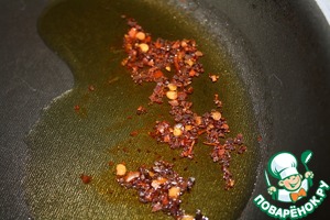 Раскалить масло и быстро обжарить в нем красный жгучий перец.