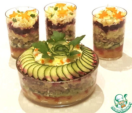 Салат из мариннованой свеклы- не такой уж частый гость на наших столах. Еще в Советские времена его готовила мая сестра, но не с горбушей (это считалось особым диликатессом и было возможно достать только по знакомству и за приличные деньги), а со скумбрией в масле. Лет 5 назад я попробовал его на праздничный стол с горбушей и салат ушел на ура. Предлагаю попробовать этот сытный и совсем не диетический салат.