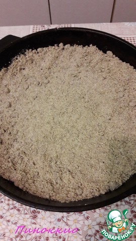 Половину крошки выложить на смазанную маслом сковороду с бортиками,