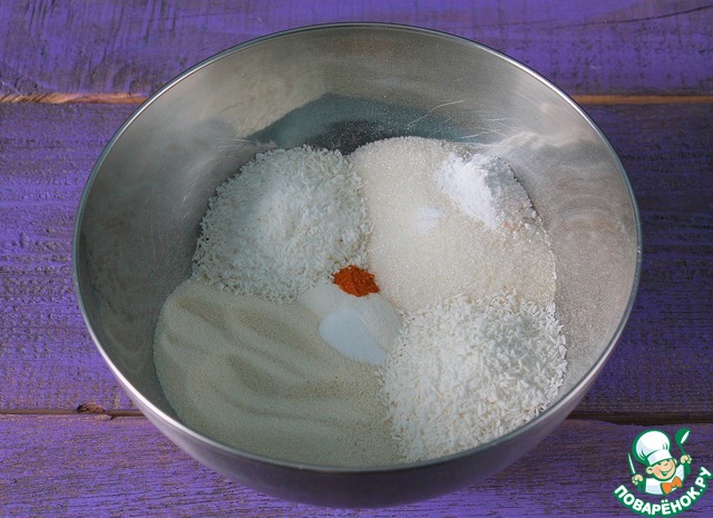 Смешиваем все сухие ингредиенты: просеиваем муку, манку, сахар, кокосовую стружку, ванилин, разрыхлитель и куркуму.