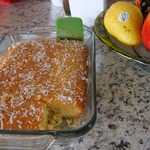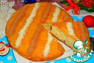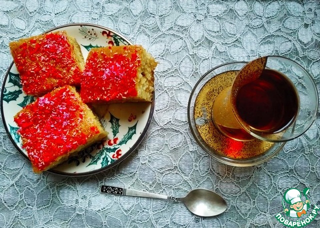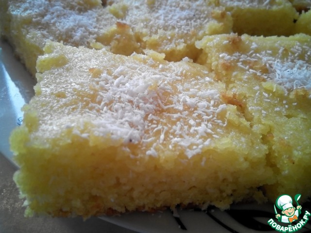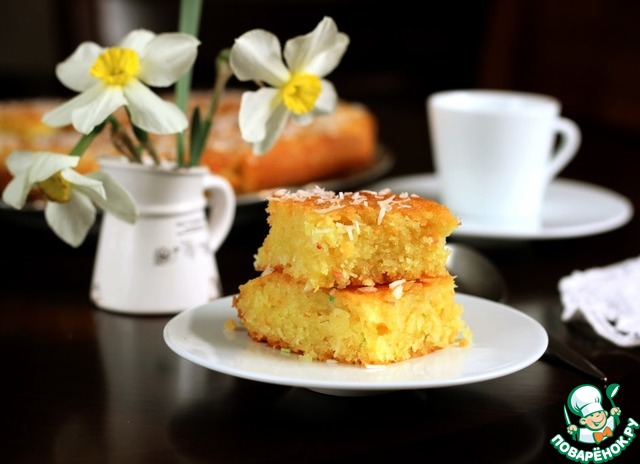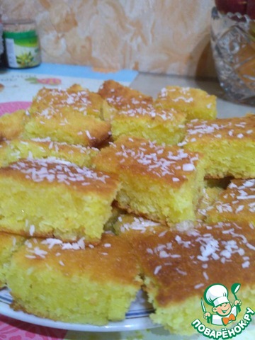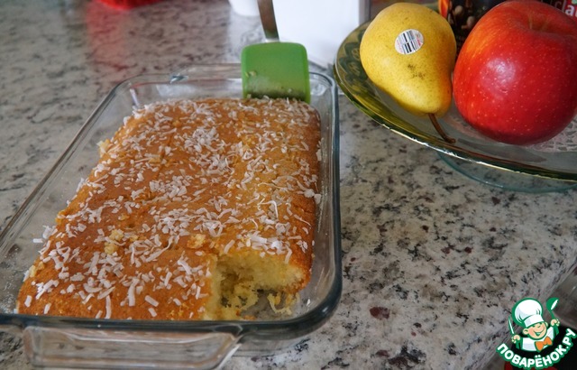 Готовый пирог достаем из духовки, нарезаем на квадраты и поливаем сиропом. Сверху посыпаем кокосовой стружкой и даем остыть!