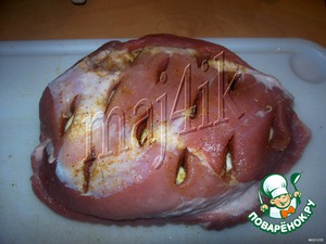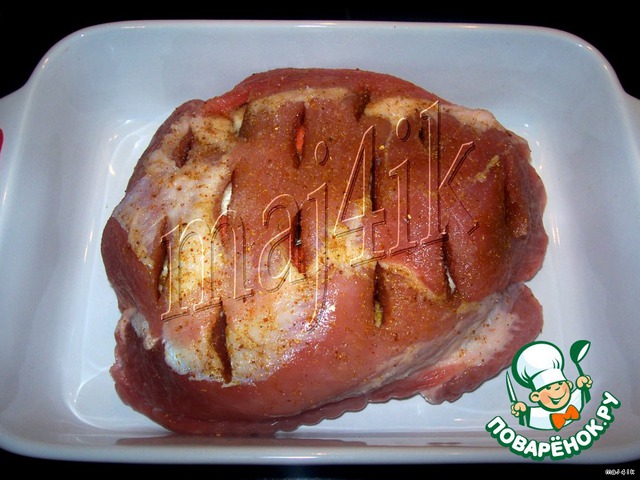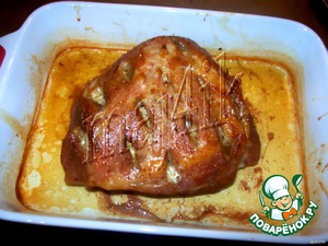 Точное время запекания трудно назвать - зависит от мяса и духовки - у нас на это ушло где-то 2.5 часа.