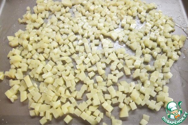 Противень смазываем растительным маслом и выкладываем картофель, слегка перемешиваем, чтобы обвалять каждый кусочек в масле. Ставим в разогретую до 180 градусов духовку на 15-20 минут.