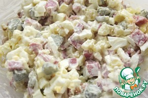 Перемешиваем все ингредиенты, заправляем майонезом, солим по вкусу.