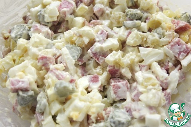 Два яйца, колбасу и огурцы мелко нарезаем. Одно яйцо, маслины и две столовые ложки картофеля откладываем для украшения.