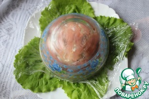 На блюдо выложить листья салата, сверху - перевернутый салатник. Снять салатник и пленку.