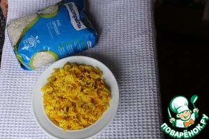 Для приготовления салата я использовала длиннозерный рис Ориент, т. к. при варке он сохраняет свою форму и не слипается. Его нужно отварить в подсоленной воде с добавлением куркумы. Я использовала 160 мл воды. Если вам удобно варить в большом количестве воды, то обязательно потом откиньте рис на дуршлаг. Рис остудите.