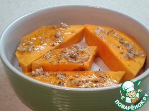 Тыкву очистить и нарезать пластинами толщиной 1 - 2 см. Выложить в форму для запекания и полить маслом со специями.