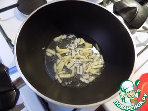 В разогретое масло выкладываем чеснок, через минуту-имбирь. Перемешиваем.