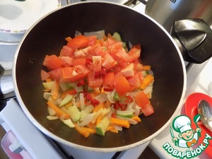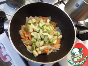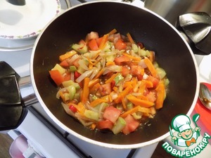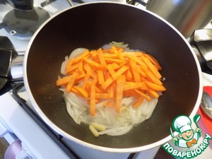 Отправляем лук, опять перемешиваем. Далее-морковь. Всё обжариваем, постоянно мешая.