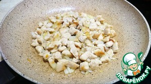 Добавляем к луку нарезанную маленькими кусочками индейку (или бекон)