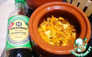 Перекладываем в горшочки, добавляем измельченный чеснок и соевый соус.