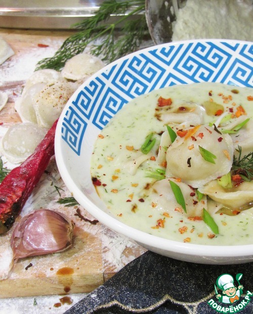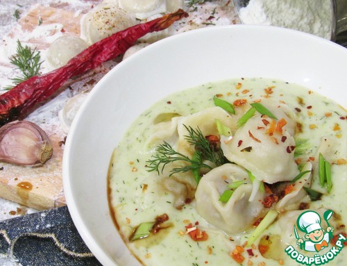 Луковый крем-суп с пельменями "Утка мандаринка"