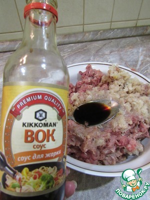 К нашему фаршу добавляем яйцо, соевый соус, устричный соус. Фарш вымешиваем. На мой вкус хватило соли, содержащейся в соусах, но если вам покажется несоленым - добавьте соли. -