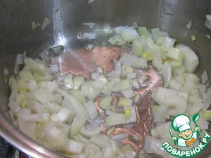 Пока идет усердная лепка пельменей, начинаем готовить суп. Обжариваем на растительном масле порезанный крупными кубиками лук.