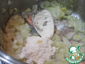 Добавляем муку и так же обжариваем до золотистого цвета.