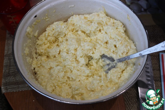Готовим начинку. Натереть сулугуни и сыр на средней терке. Смешать его с яйцами, творогом и молоком. Попробуйте на соль. Как правило, солить не нужно. -