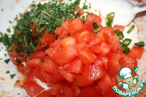 Мелко порезать помидоры, добавить петрушку, йогурт, мелко нарезаный перчик чили.